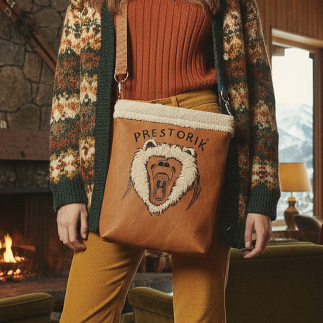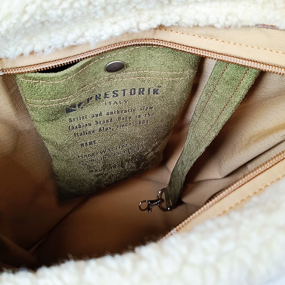 Borsa unisex in pelle riciclata, interno foderato in cotone, taschino in microfibra e portachiavi. Sul fronte disegnato l’ Animal Spirit laserato e finito con pelo orsetto. tracolla in pelle riciclata e dettagli al laser, moschettoni in metallo. Dimensioni altezza cm 40 larghezza cm 35 profondità cm 15. Totalmente prodotta in casa Prestorik Italia.