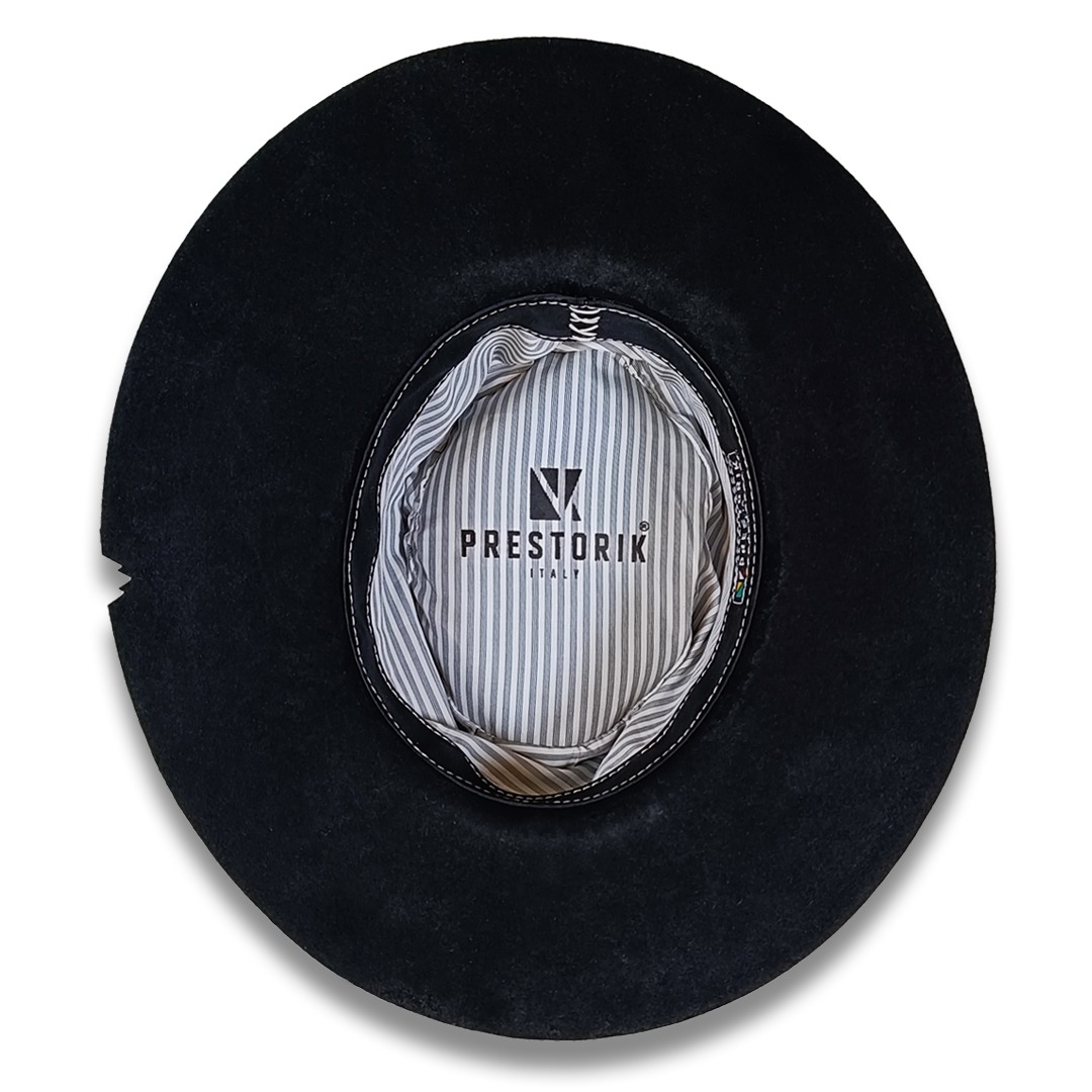 Realizzato artigianalmente a mano in pregiato feltro di lana color nero (130 g, medio peso), viene spazzolato e infiammato con grappa per conferire un aspetto leggermente vissuto.