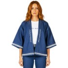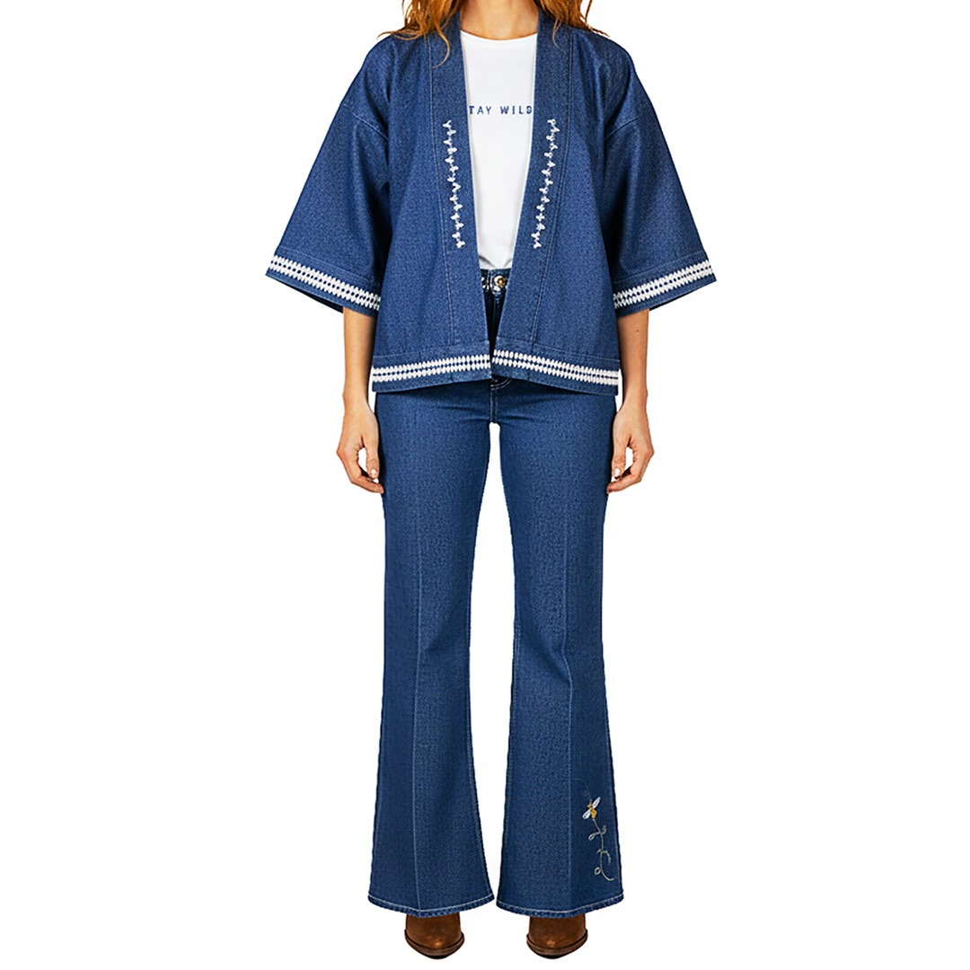 Giacca kimono corta da donna in denim blu indaco, taglio sartoriale e artigianale. Foderata in popeline 100% cotone gessato per comfort e qualità. Ricami a foglia lungo maniche e bordo, dettagli frontali e ape sul retro. Vestibilità ampia e versatile, facile da abbinare a t-shirt, camicie, felpe, maglioni e persino piumini. Manica larga al gomito, lunghezza sotto la cintura. Taglia unica. Prodotto interamente in Italia.