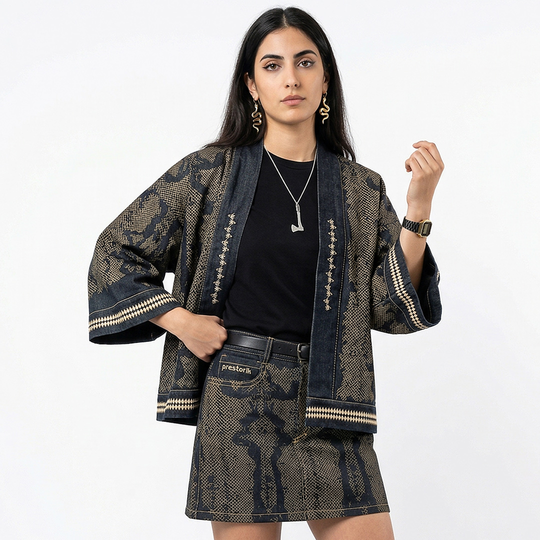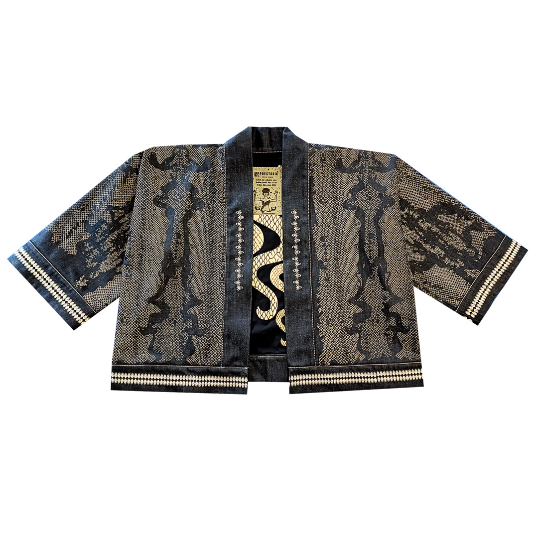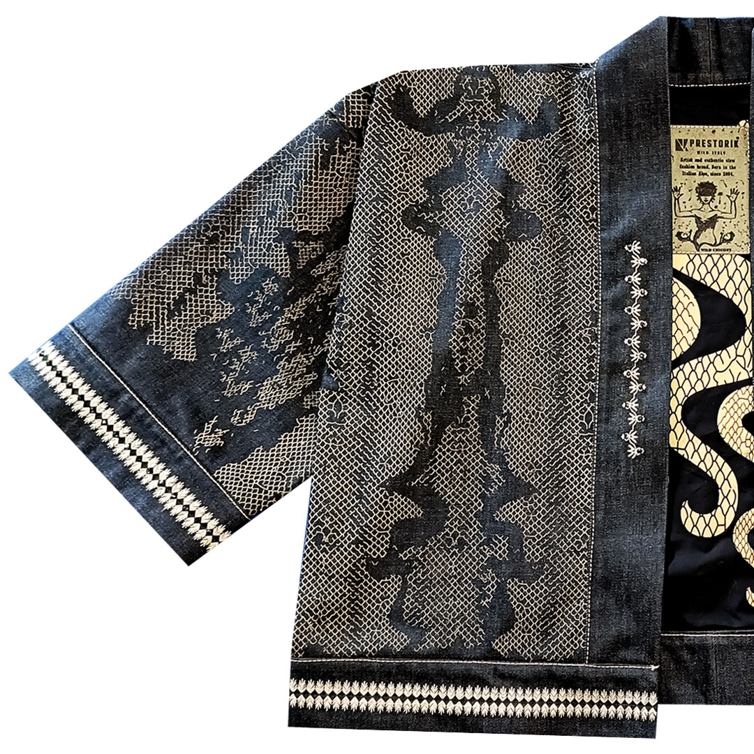 Un capo che unisce culture e simboli: rifugio in Giappone, roccia in Turchia, corpo vitale in India, grazia e femminilità in Africa e Scandinavia. Solida come il denim, fluida come un kimono, resa unica dai ricami a mano.