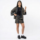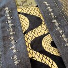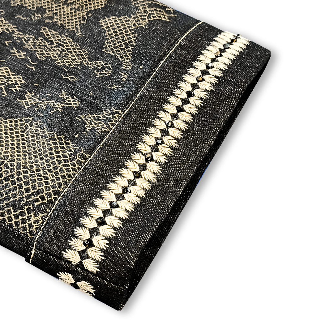 Il denim stampato in serigrafia artigianale simula la pelle della viperera.