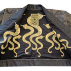 Giacca kimono corta da donna in denim nero , taglio sartoriale e artigianale. Foderata in popeline 100% cotone stampato in serigrafia artigianale. Ricami a foglia lungo maniche e bordo, dettagli frontali. Vestibilità ampia e versatile, facile da abbinare a t-shirt, camicie, felpe, maglioni e persino piumini. Manica larga al gomito, lunghezza sotto la cintura.