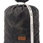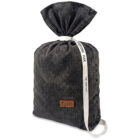Completa il design una pratica e ricamata bretella per il trasporto , che richiama ironicamente il laccio dei classici sacchi dell’immondizia.