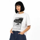 Maglietta donna ampia di alta qualità, fresca, morbida, antipilling, non perde la forma, cucitura laterali, prodotta in Italia dal filato, stampa serigrafica a mano, 100% cotone vestibilità ampia corta alla cintura.