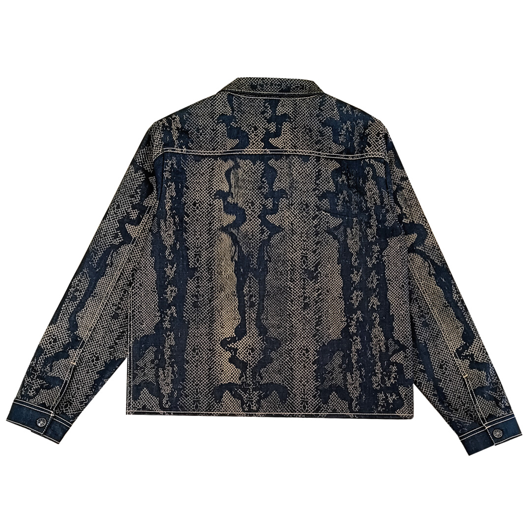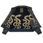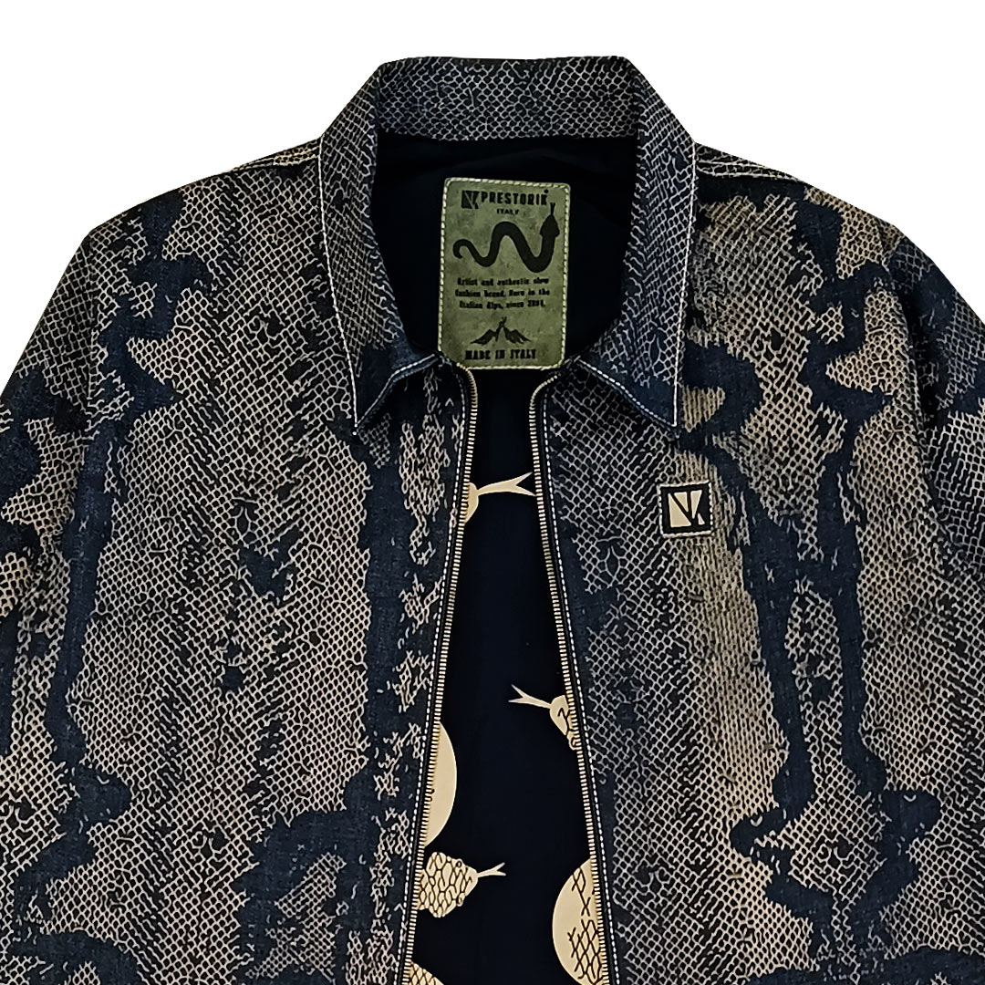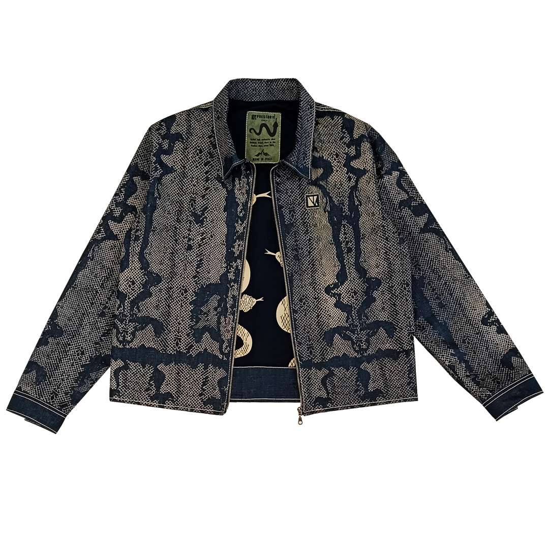 Il valore di questo pezzo risiede nel tempo: occorrono oltre 3 ore di lavorazione manuale solo per la fase di stampa. Il pattern “pelle di vipera” esterno e l’iconica grafica interna dei serpenti sono realizzati in serigrafia artigianale, un processo lento e meticoloso che rende ogni giacca unica e irripetibile.